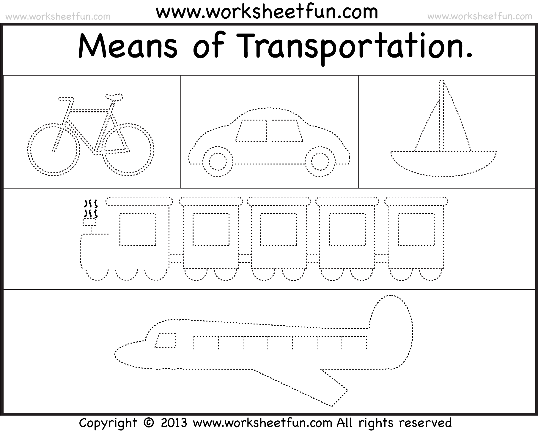Means of Transportation – Tracing Worksheet – Preschool and Kindergarten – bike, train, car, boat, aeroplane